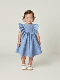 Abito rosa chiaro con balze e fiore applicato, perfetto per eventi speciali.
